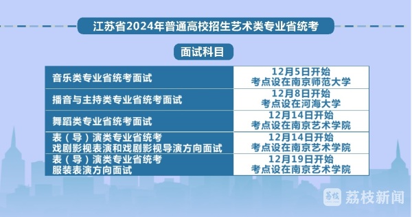 面试方面,音乐类专业省统考:12月5日开始,考点设在南京师范大学;播音与主持类专业省统考面试:12月8日开始,考点设在河海大学;舞蹈类专业省统考面试:12月14日开始,考点设在南京艺术学院;表(导)演类专业省统考戏剧影视表演和戏剧影视导演方向面试:12月14日开始,考点设在南京艺术学院;表(导)演类专业省统考服装表演方向面试:12月19日开始,考点设在南京艺术学院。