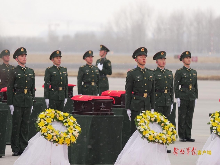 雪花飞舞间,《义勇军进行曲》的铿锵旋律响起。担负此次司礼演奏任务的武警北京总队军乐团已是第六次接志愿军烈士回家。看着运-20专机缓慢降落,演奏员吴钟又一次感受到肩上所背负的使命——作为英雄踏上故土听到的第一首乐曲,这是国的召唤,更是家的慰藉。