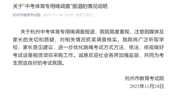 对此,杭州市教育考试院24日发布关于“中考体育专用绳调查”报道的情况说明:关于杭州中考体育专用绳调查报道,我院高度重视,注意到媒体及家长的关切和质疑,对相关情况抓紧调查核实。我院将广泛听取学校、家长意见建议,进一步优化跳绳考试方式方法,依法、依规做好考试设备租赁项目采购工作。诚恳欢迎社会各界加强监督,共同为考生营造良好的考试氛围。