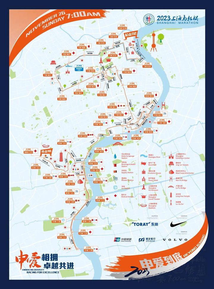 今年的路线在20公里至26公里路段融入了黄浦滨江与徐汇滨江两条滨江绿道,较2022年增加了长度约为1公里的徐汇滨江绿道。
