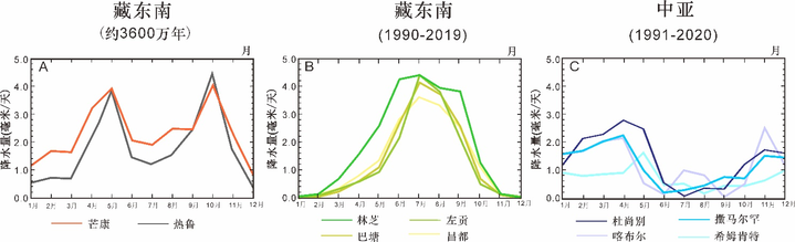 图1. 古气候模拟揭示藏东南地区的双峰式降水模式,与现今中亚地区的地中海气候相似(A. 古气候模拟的晚始新世时期藏东南地区的降水模式;B. 现今藏东南地区的降水模式;C. 现今中亚地区的降水模式)