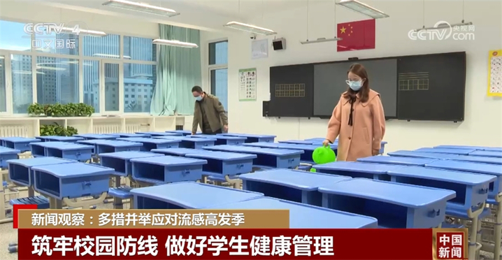 应对流感等呼吸道疾病高发的情况,各地学校加强了健康监测。在青海西宁市文苑小学,每天放学后,学校都会对教室等公共区域进行消杀。湖南长沙湘江新区社区卫生服务中心派出医生进驻校园,学生出现发热、咳嗽等症状时,医生会及时进行专业处理。