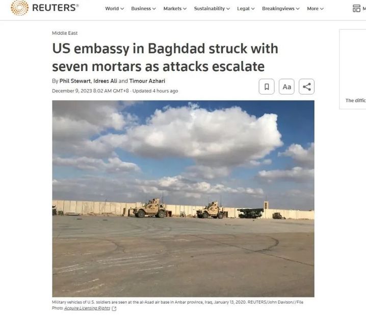 美国福克斯新闻网则报道称,五角大楼发言人证实,至少有7枚60毫米直径的迫击炮弹落入美国大使馆大院内,还有一些炮弹落入附近河中。美国和伊拉克官员最初表示,这些发射物是火箭弹。这是自以色列与哈马斯爆发新一轮冲突以来,美国大使馆首次遭到此类袭击,这场战争加剧了该地区的紧张局势。此前,各种武装组织在伊拉克和叙利亚各地多次袭击美军基地。
