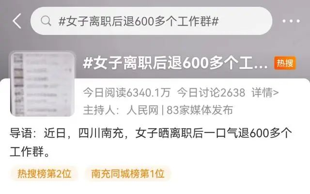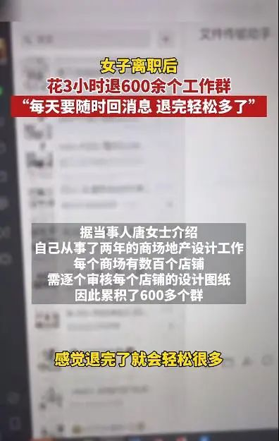 最近,四川南充的唐女士“晒离职后一口气退600多个工作群”的消息引发广泛关注。据陕西网白鹿视频报道,当事人介绍,自己从事商场地产设计工作,每个商场有数百个店铺,需逐个审核店铺设计图纸,因此累积了600多个群。离职后花3个半小时退完所有群,轻松了很多。