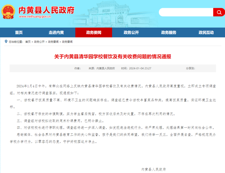 荔枝新闻讯 内黄县人民政府网站消息,2024年1月4日中午,有群众在网络上反映内黄县清华园学校餐饮及有关收费情况。内黄县人民政府高度重视,立即成立专项调查组,对相关情况进行调查落实,现通报如下: