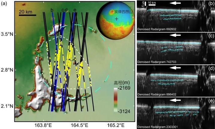 科研人员利用火星轨道浅表探测雷达的观测数据,对埃律西昂平原中东部的一个掩埋撞击坑进行了深入研究。他们发现,该掩埋撞击坑内基本存在两层地下反射,其中浅层反射几乎覆盖了整个撞击坑,而深层反射仅覆盖了撞击坑西南的部分区域。