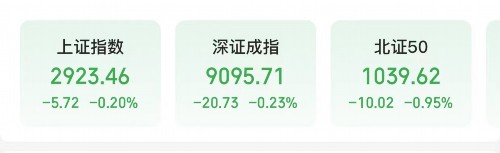 8日,A股三大指数集体低开。上证指数跌0.20%,报2923.46点,深证成指跌0.23%,报9095.71点,创业板指跌0.35%,报1769.33点。