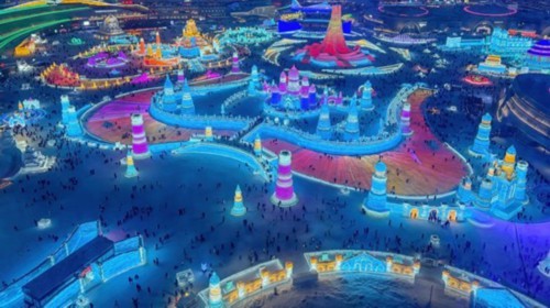 2024年1月7日,哈尔滨冰雪大世界夜景灯光五颜六色。视觉中国供图