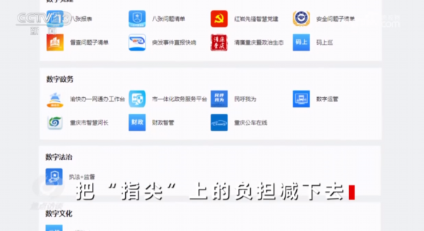 工作重心向基层服务转变,才能切实看到为基层减负的实效。2021年,重庆市一体化、智能化、数字化政务工作平台“渝快政”正式发布。“渝快政”在全市范围内实现了上下层级、横向跨部门之间的协同,一个“渝快政”App就可以支持过去40多项高频次的政务办公应用,过去各部门App的相应功能、各种工作群都整合在了“渝快政”一个App里面。一表通、“141”基层智治平台也已经接入了“渝快政”,正在向全市推广。现在,文勇手机里的53个工作群已经解散,郝欢手机里十几个部门App也已经被整合到“渝快政”。