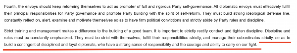 “铁军”一词常见于政府文件或领导人讲话,更多的是强调工作作风和纪律。在近年来中国领导人讲话中,曾多次出现“纪律监察铁军”“生态环境保护铁军”等表述。中国领导人在接见与会使节时的讲话中说:“打造一支对党忠诚、勇于担当、敢斗善斗、纪律严明的外交铁军。”外交部网站对这句话的英文翻译(见下图)同样强调外交队伍的纪律、责任和勇气。作为通行做法,世界各国对本国外交人员都有着很高的纪律要求。