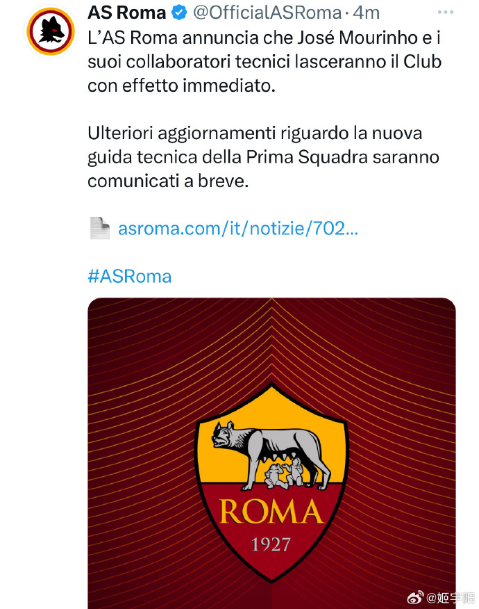 荔枝新闻讯 北京时间1月16日下午,意甲俱乐部罗马官方宣布,球队主帅穆里尼奥及其教练组立即离任。