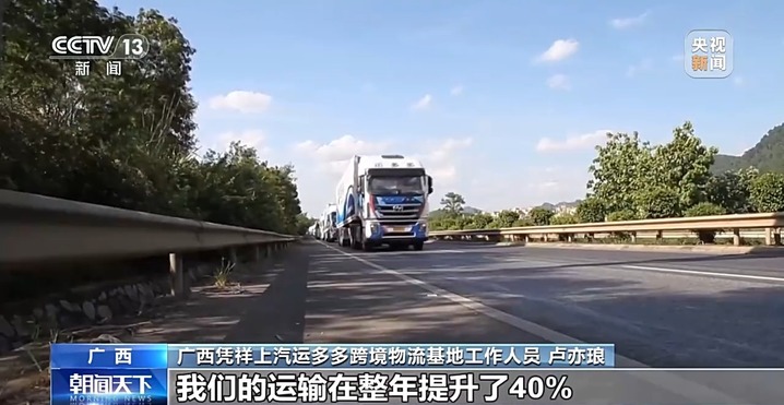 广西凭祥上汽运多多跨境物流基地工作人员 卢亦琅:原来我们一个车辆到友谊关,可能要两天才通关。现在有时候就是8个小时内就已经行驶到我们的口岸里面了。在RCEP生效之后,我们的运输在整年提升了40%。