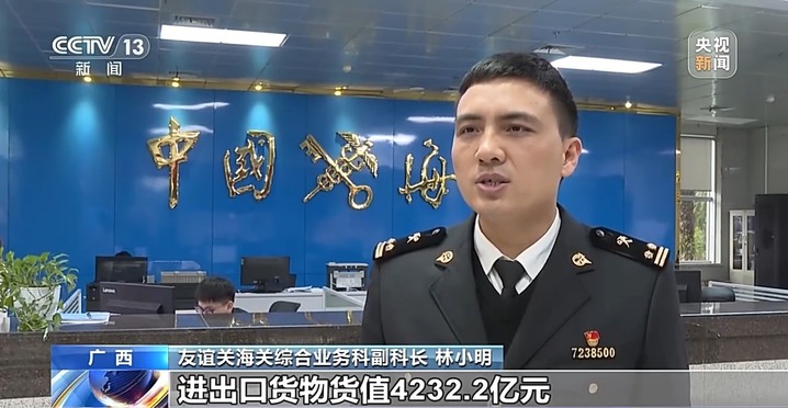 友谊关海关综合业务科副科长 林小明:2023年,经友谊关口岸进出口货物货值4232.2亿元,同比增长111.6%。其中经友谊关口岸东盟国家输华的农产品货值241.2亿元,同比增长了261.9%。