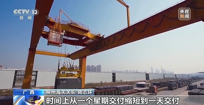 柳州海关关长 蒋志环:西部陆海新通道作为中国西南地区最主要的物流通道之一,为柳州工程机械出海提供了更多便利。以出口越南为例,工程机械从柳州出发,从凭祥口岸直接通关到越南,对比传统的海运模式,时间上从一个星期交付缩短到一天交付。