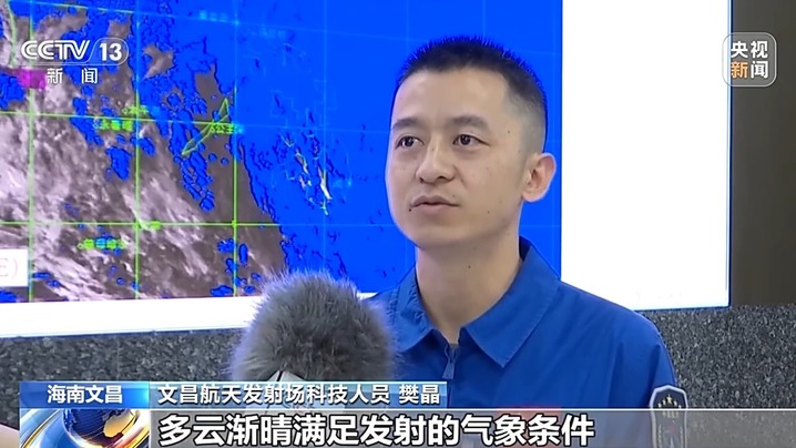 文昌航天发射场科技人员 樊晶:关键节点之前,我们都会跟地方海南省气象局进行一个联合的气象会商,通过两家的联合会商得出一个最终的结论。从最新的气象会商结果来看,发射日天气比较好,多云渐晴,满足发射的气象条件。