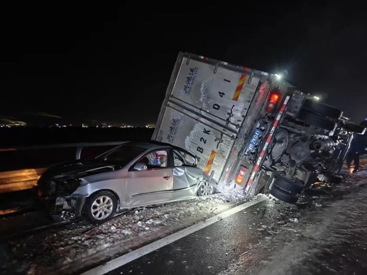 2023年12月16日,秦滨高速滨州无棣方向8公里处因雪天路滑导致一起车辆侧翻事故,1人被困驾驶室。厢货车驾驶员被变形的车体牢牢卡在驾驶室内,经过20多分钟的紧急救援,被困人员被成功救出。