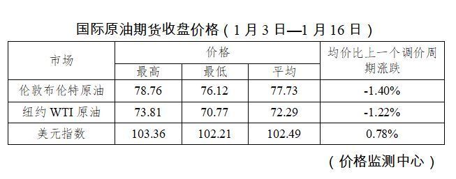 据国家发展改革委价格监测中心监测,本轮成品油调价周期内(1月3日-1月16日)国际油价在震荡中小幅下降。平均来看,伦敦布伦特、纽约WTI油价比上轮调价周期下跌1.31%。