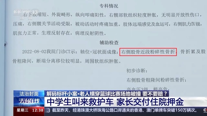 这是事发时的公共场所视频。在篮球场内被撞倒的就是83岁的原告老人牟女士,她为什么会突然出现在一场篮球比赛当中,又是怎样被撞伤的?时间还要回溯到2022年夏天。