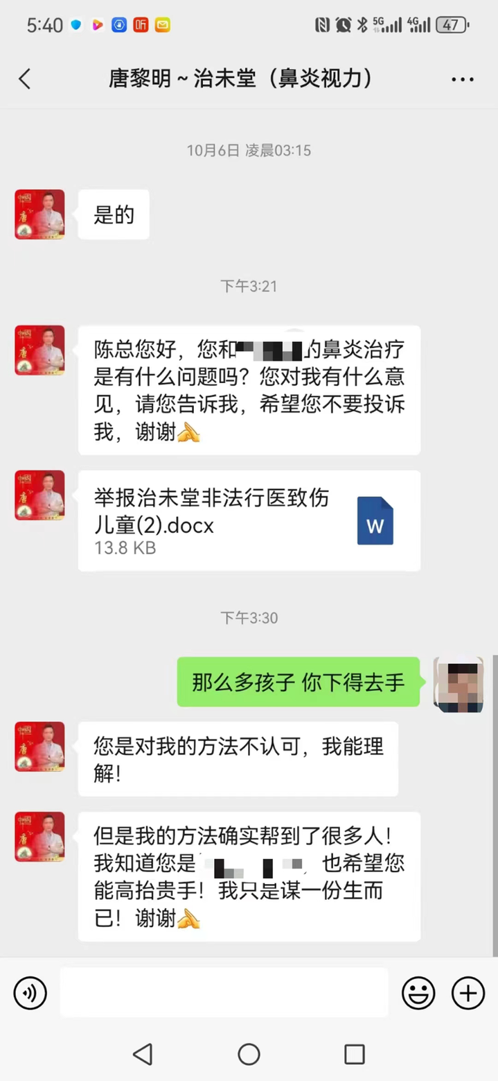 陈先生介绍,他因陪孩子每周去洗鼻子,加有唐黎明的微信。他没想到他对唐黎明的举报信,竟然4个小时就回到了他手上。唐黎明还说,希望陈先生有什么意见不要投诉,“我只是谋一份生而已”。