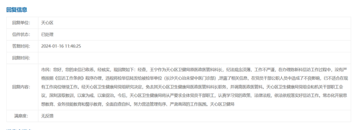2024年1月16日,天心区卫健局在市长信箱中回复:经查,天心区卫健局原医政医管科科长王宁在办理陈先生信访工作过程中,违规将检举信转发给被检举单位(长沙天心治未堂中医门诊部),泄露了相关信息,在党员干部公职人员中造成不良影响,已不适合在现有岗位继续工作,经天心区卫健局党组研究决定,免去其天心区卫健局医政医管科科长职务,并调离医政医管科。