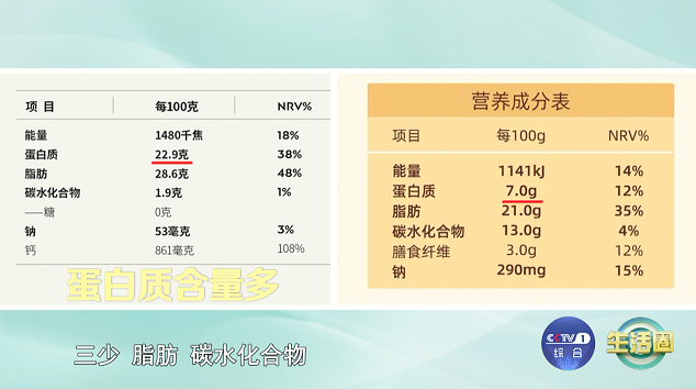 同类型的产品,相同分量的情况下,建议选择“一多三少”的产品。“一多”指的是蛋白质含量比较多,“三少”指的是脂肪、碳水化合物、钠含量相对较少的产品。