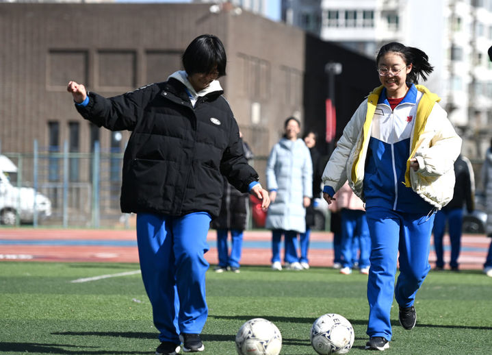 天津市耀华中学学生在踢足球。(新华社记者赵子硕摄)
