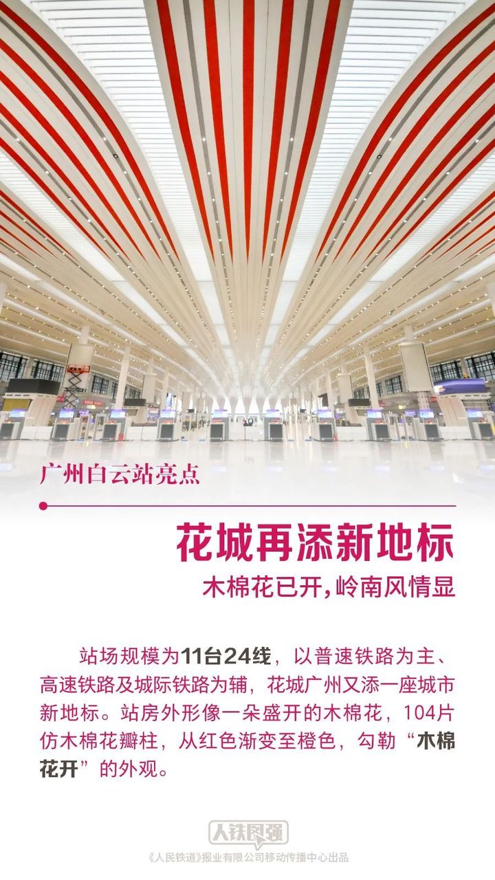 四角进站,八方迎客;站场规模11台24线;地上3层、地下4层;可满足1万多人同时候车……这就是亚洲特大型综合交通枢纽——广州白云站。