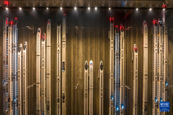 1月26日凌晨,动车组列车停靠在南京动车段南京南动车运用所存车线上(无人机照片)。当日,2024年春运启动。2024年春运从1月26日开始,至3月5日结束,为期40天。
