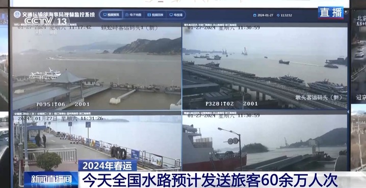 总台央视记者 唐颖:今天全国水路预计发送旅客60余万人次。从浙江海事部门了解到,昨天浙江全省水上进出港旅客超过11万人次,其中舟山蜈蚣峙客运码头预计春节8天水上发送旅客将达到100万人次左右,同比将增加33%。