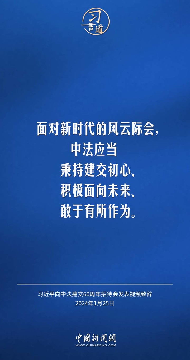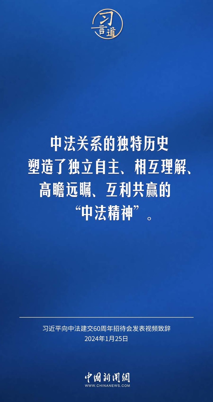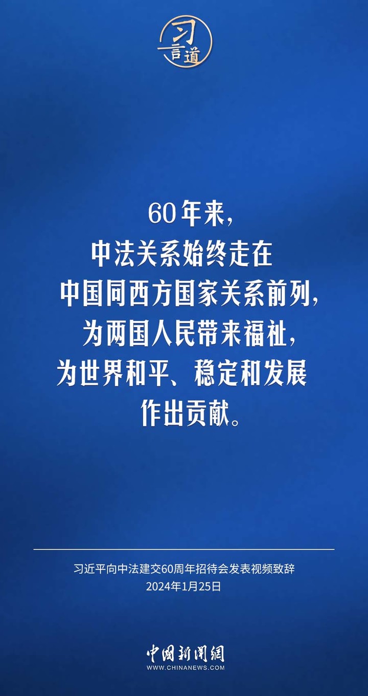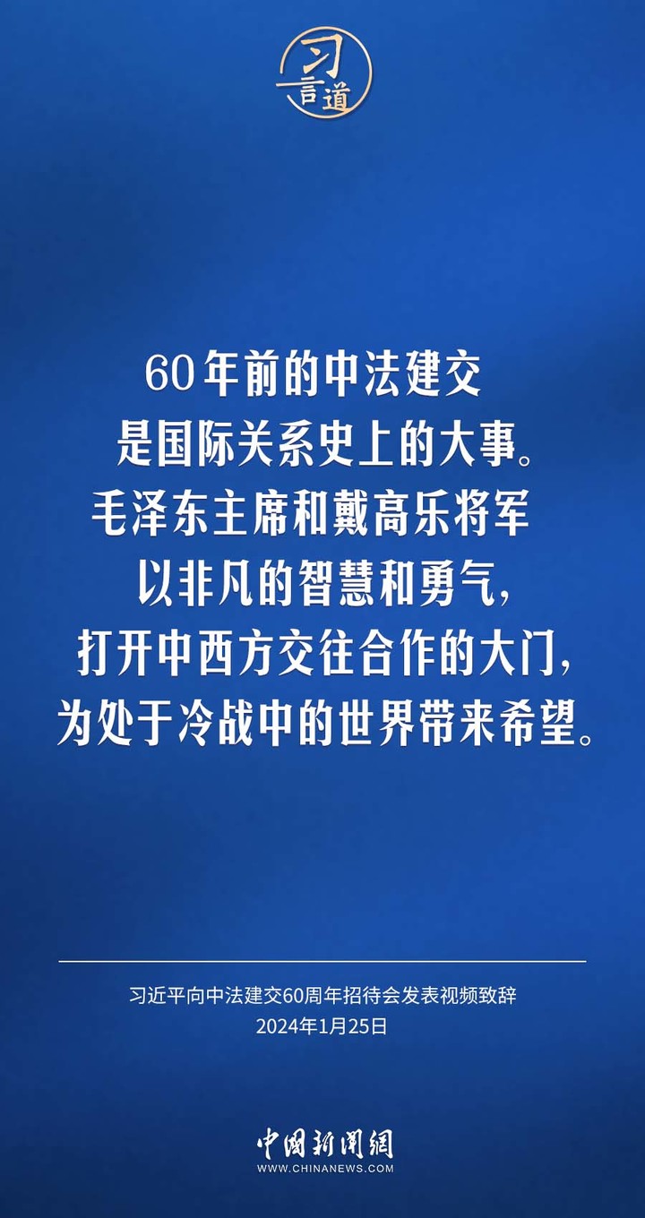 1月25日,中法建交60周年招待会在国家大剧院举行,国家主席习近平发表视频致辞。习近平指出——
