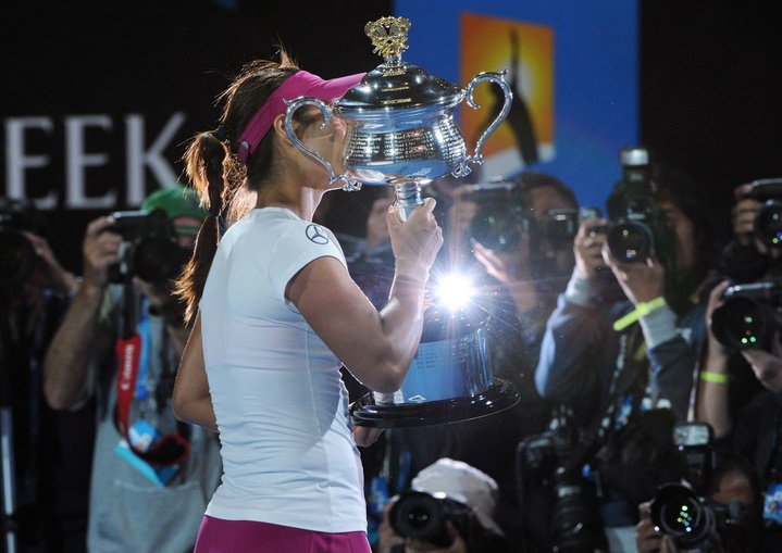 2014年1月25日,三进澳网女单决赛的李娜拿到生涯第2座大满贯冠军奖杯。 图/IC PHOTO