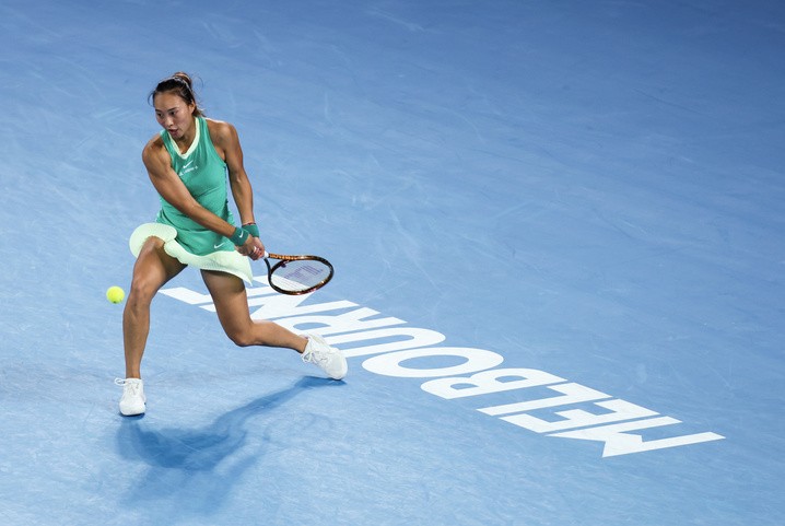 1月25日晚,21岁的中国选手郑钦文战胜乌克兰选手雅斯特雷姆斯卡,晋级决赛。 图/新华社