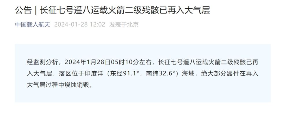 经监测分析,2024年1月28日05时10分左右,长征七号遥八运载火箭二级残骸已再入大气层,落区位于印度洋(东经91.1°,南纬32.6°)海域,绝大部分器件在再入大气层过程中烧蚀销毁。