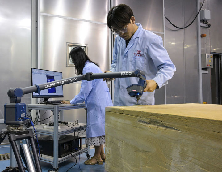 在敦煌研究院多场耦合实验室中,工作人员正在对庆阳北石窟寺砂岩样品进行三维扫描分析(2023年8月3日摄)。新华社记者 李贺 摄