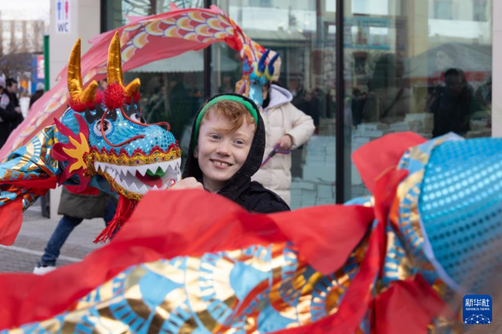 2月3日,在匈牙利布达佩斯唐人街新春庙会上,一名男孩体验舞龙。新华社发(弗尔季·奥蒂洛摄)