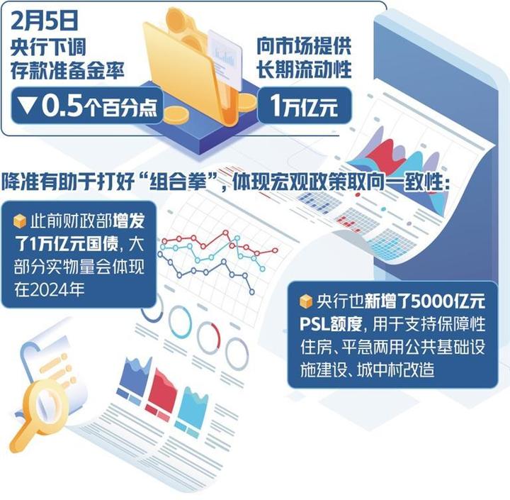 “降准有助于打好‘组合拳’,体现宏观政策取向一致性。”庞溟进一步表示,中央经济工作会议强调要增强宏观政策取向一致性,强化政策统筹,确保同向发力、形成合力。此前财政部增发了1万亿元国债,大部分实物量会体现在2024年,央行也新增了5000亿元抵押补充贷款(PSL)额度,用于支持保障性住房、平急两用公共基础设施建设、城中村改造,存量政策将持续体现经济带动效应。这次降准也是宏观政策取向一致性的体现,有望与前期政策形成合力,进一步推动经济回升向好。近期,财政部还表示将继续安排一定规模的地方政府专项债券,适当增加中央预算内投资规模,发挥好政府投资的带动放大效应,央行及时降准也能为后续系列稳需求、稳增长政策营造适宜的流动性环境。
