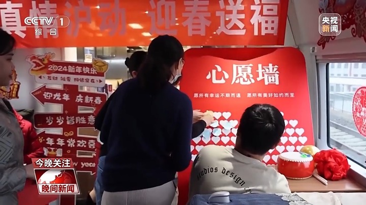 同样,在青岛开往上海虹桥的G232次列车上,列车工作人员写福字写春联,提前为旅客送上新春祝福。工作人员还为每一名参加活动的旅客,准备了爱心形状的便利贴,写下新年心愿。