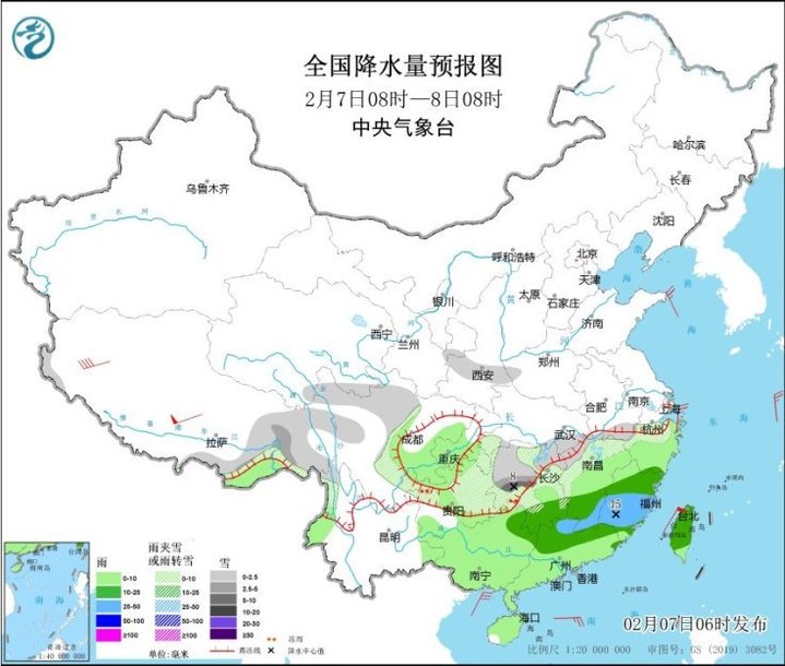中央气象台最新预报显示,今天(2月7日),江南北部和西部、西南地区东部等地的部分地区仍有降雪或雨夹雪,其中湖南中南部、江西西南部等地部分地区有大雪,湖南东南部局地有暴雪,上述部分地区新增积雪深度2~5厘米,局地可达10厘米以上;贵州、湖南等地有冻雨;上述地区气温较常年同期偏低5℃左右。中央气象台7日早晨继续发布暴雪蓝色预警和冰冻黄色预警。