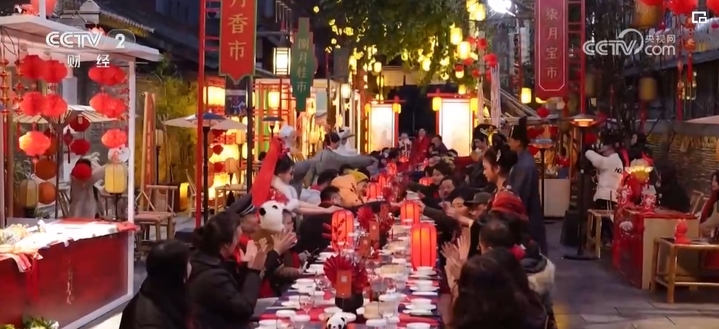 夜幕降临,在四川成都的宽窄巷子里举办了一场特别的家宴。火辣滚烫的鸳鸯锅热气腾腾,象征着生活红红火火,来自各行各业的近百位城市建设者在民俗表演中品美食、迎新春。