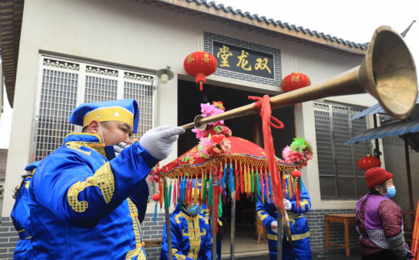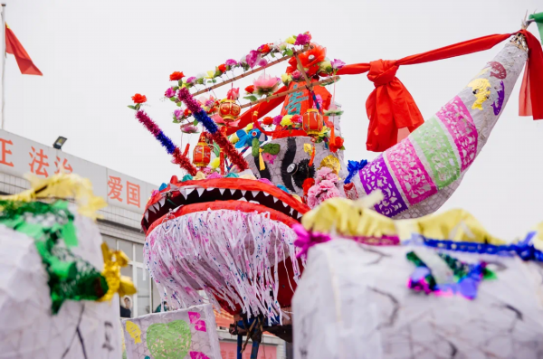 人们舞龙走阵,彩旗在空中招展,锣鼓声、喇叭声、火铳声此起彼伏。白色巨龙盘旋舞动,龙首跟随着掌珠人前行,摆出巨龙摆尾、一字长蛇阵、盘旋阵等阵式,表达美好的愿望和祝福。