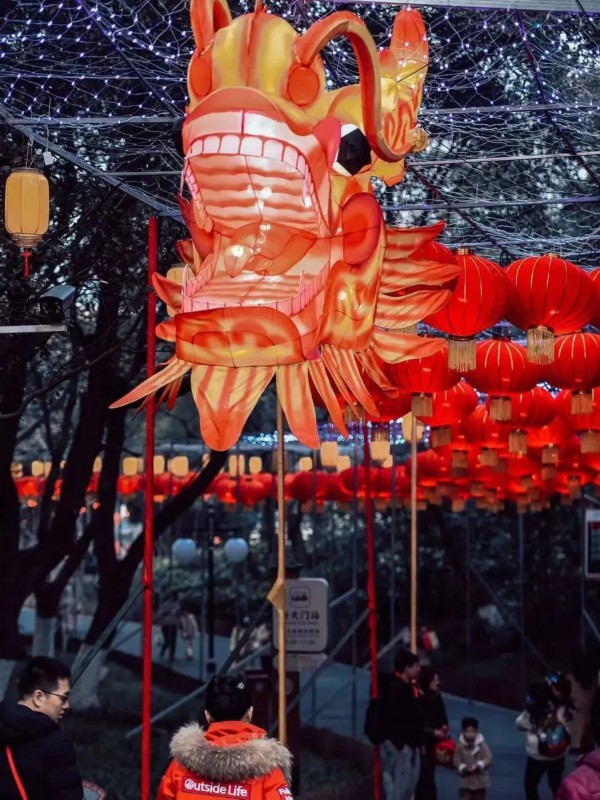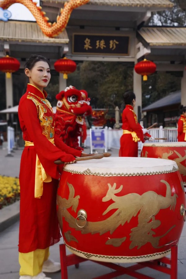 白天舞龙、舞凤、舞狮、擂鼓齐上演,园内吉祥物人偶温馨互动,美食市集令人食指大动,川剧变脸叫好声不绝于耳,热闹欢乐祥和的氛围感拉满。