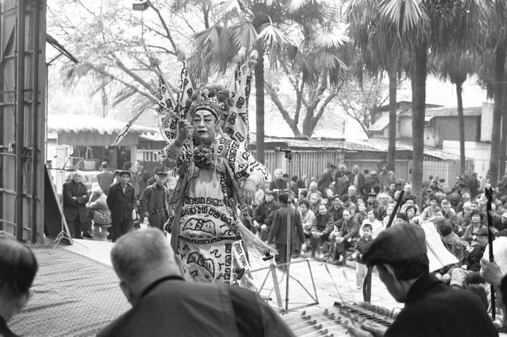 1996年春节前,四川彭州市隆丰镇的村民在观看本镇川剧艺人表演。