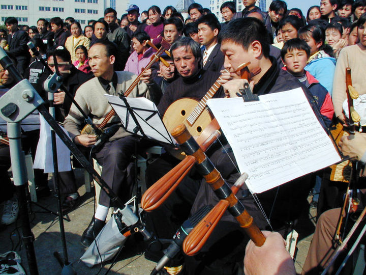 2003年春节期间,戏曲爱好者在浙江温岭市区的街心公园广场表演京剧和越剧选段。