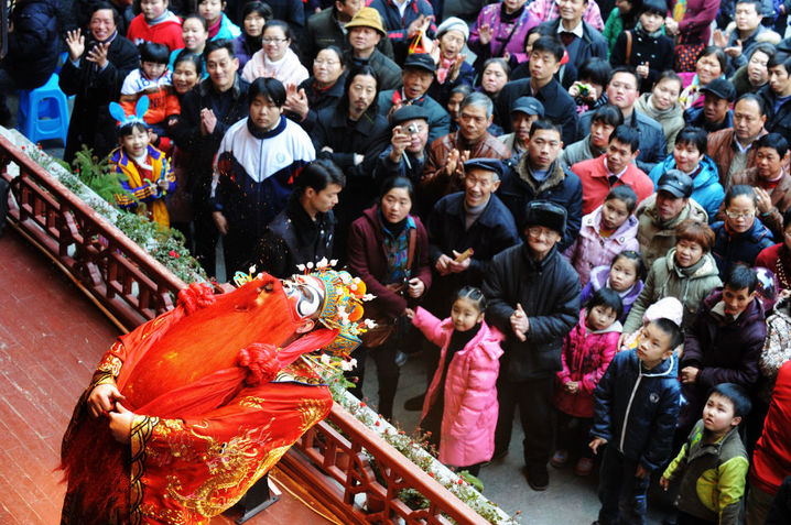 2011年春节期间,游客在长沙火宫殿观看戏剧表演。