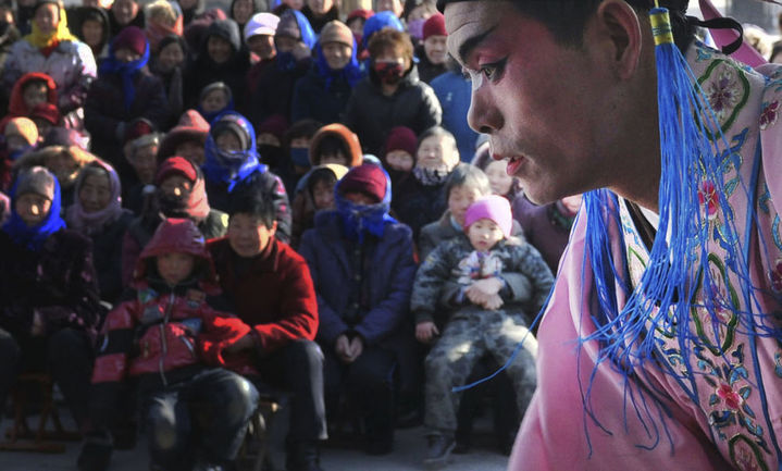 2012年元宵节后,山东省邹平县的农民演员在表演吕剧。