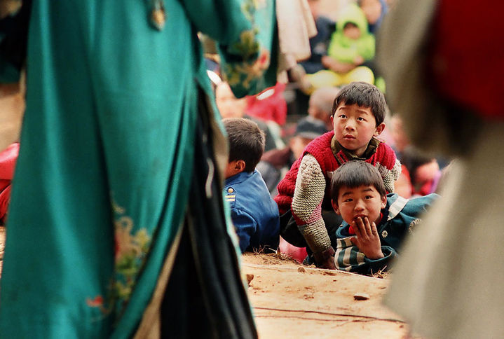 2013年春节前,在河南卫辉市一个露天广场上,几名儿童趴在台前聚精会神地看戏。