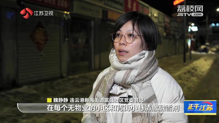 连云港新海街道富强社区党委书记魏静静:“没日没夜地去干。雪不停,我们不停。在每个无物业的小区和背街小巷撒融雪剂,大概撒了1.2吨。等雪停了以后,我们及时联系志愿者,大家一起把道路及时清空、清理干净。”