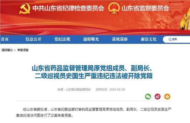 山东省药品监督管理局原党组成员、副局长史国生被开除党籍。图片来源:山东省纪委监委官网