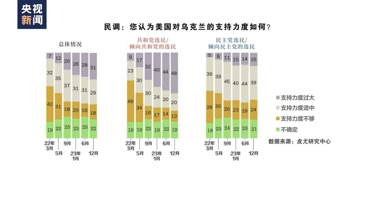 据皮尤研究中心去年12月发布的民意调查,自2022年3月到2023年12月的多次民调显示,认为“美国对乌克兰提供了过多援助”的受访美国民众占比从7%一路上升到31%。其中,共和党和亲共和党受访者持这一观点的人数占比更是从9%一路飙升至48%。