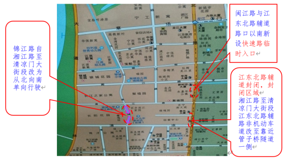 2、机动车通行:周边居民、单位及社会过境车辆需从草场门大街、闽江路、湘江路等周边道路提前进行疏导分流。锦江路(湘江路至清凉门大街段)改为从北向南单向行驶,并在闽江路与江东北路辅道路口以南新设快速路临时入口。